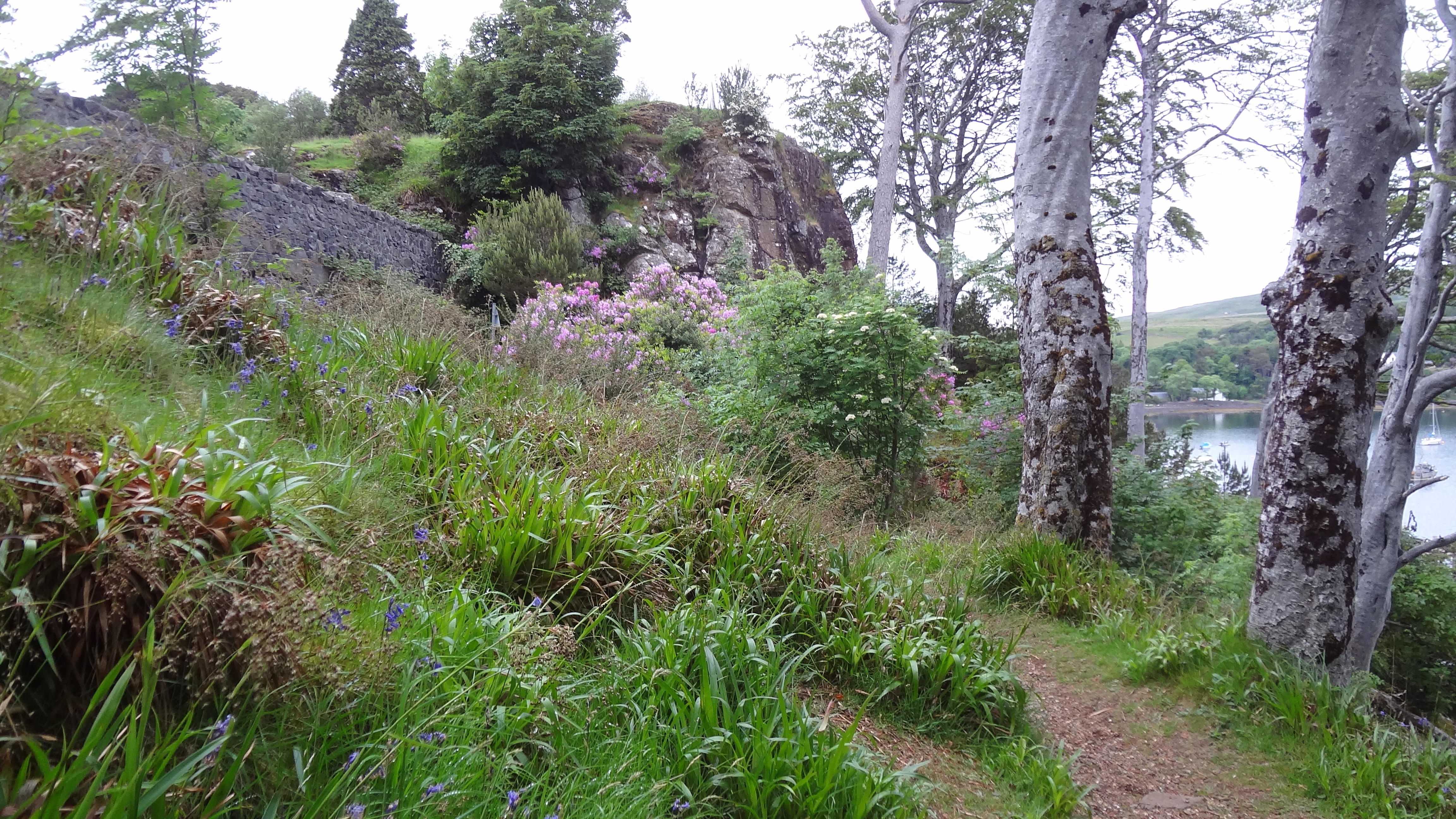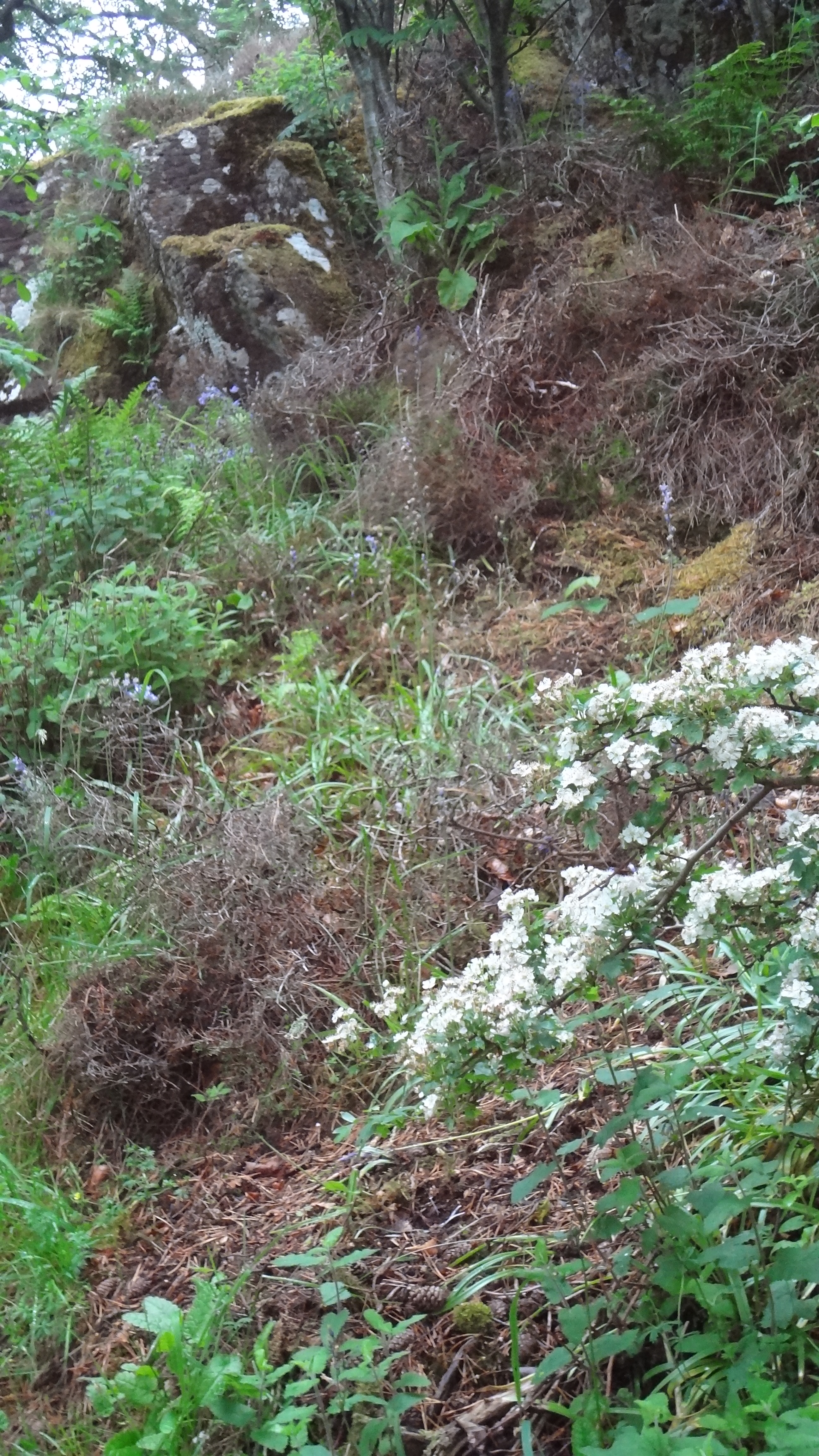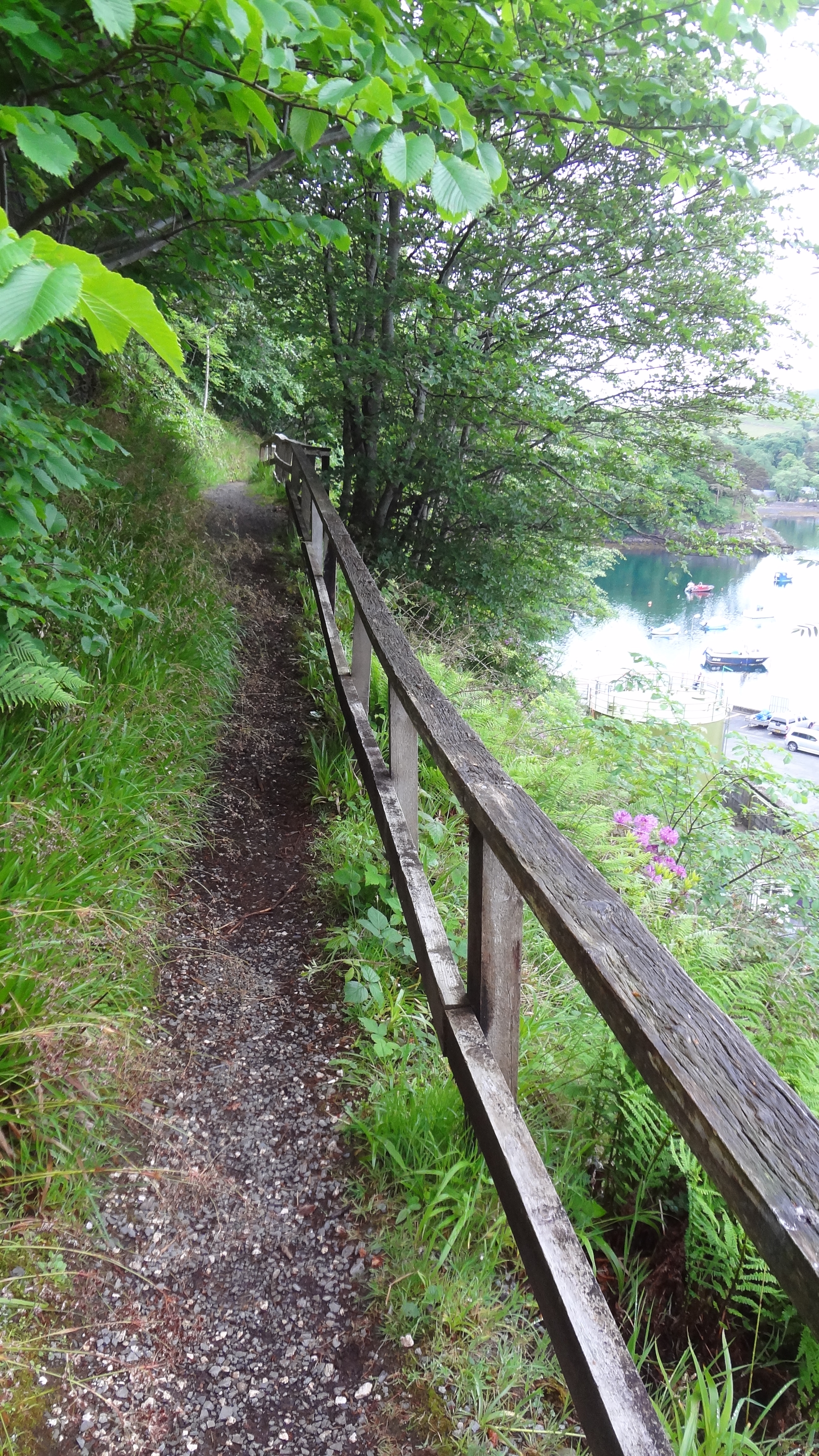 I set out for an after dinner, before going to the pub walk, following a small road behind the hostel. At the end was a stair up the cliff, then this enchanting wooded path jee-ust around the edge of the lump.